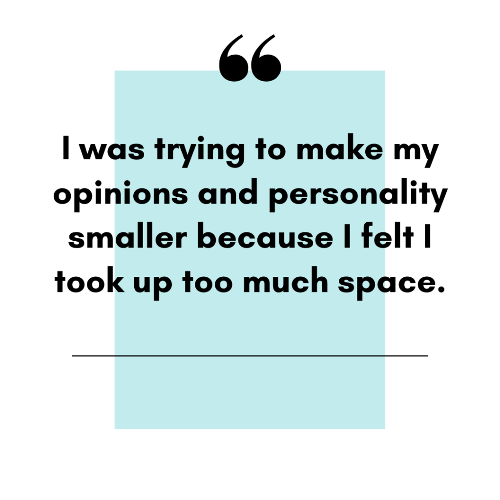 “I was trying,” Maggie told me, “to make my opinions and personality smaller because I felt I took up too much space.” These words embody how many of us feel about ourselves. This is the reason I have taken over an hour to beautify for a date. I felt I had to be “perfect” just to compensate for my weight, why I’ve developed a host of other insecurities because I feel like I already have one giant thing working against me.